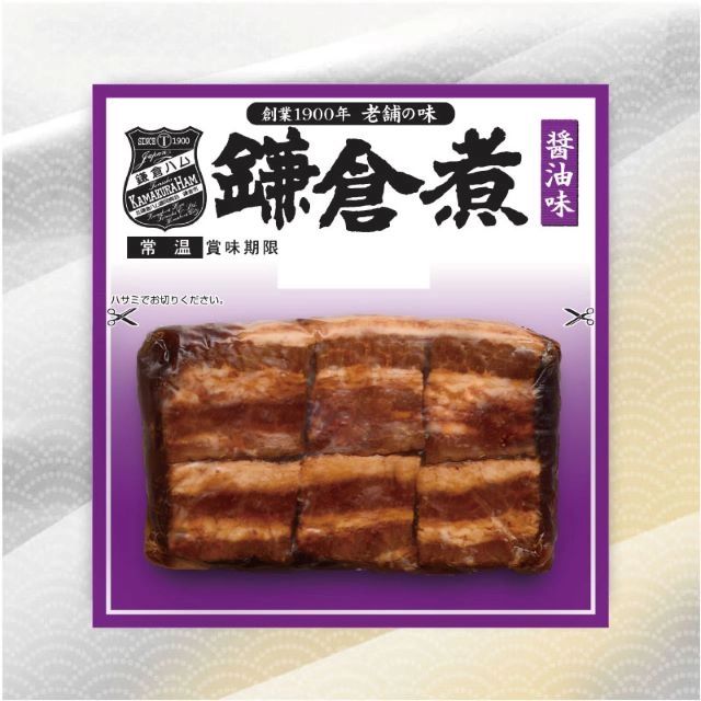 創業明治33年の『鎌倉ハム富岡商会』が販売する「鎌倉煮」。豚バラ肉を醤油ベースの特製ダレで味つけし、柔らかく煮込んだ角煮はご飯のお供にぴったりです。レトルトパウチなので常温保存可能で、湯煎すれば簡単に食べられます。