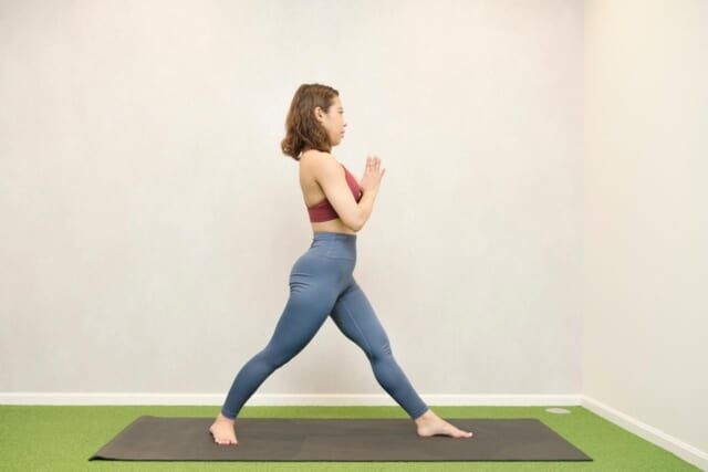 反対側も同様に行います。なお、期待する効果をきちんと得るためには「脚を大きく後ろに引く際も前脚のひざを曲げる際も、常に骨盤をまっすぐ正面に向けたままにすること」がポイント。また、不自然に肩が上がってしまったり、腰が反ったりしないように注意してくださいね。<ヨガ監修:Minami(インストラクター歴4年)>