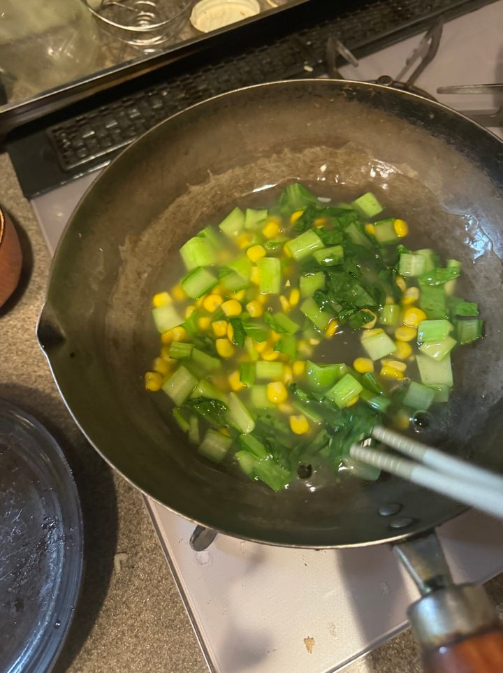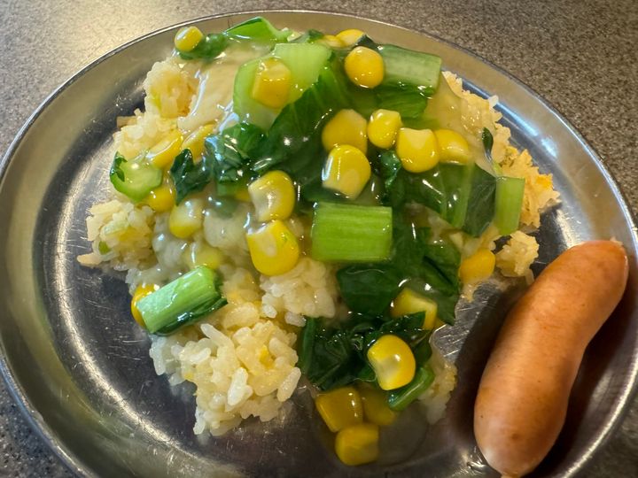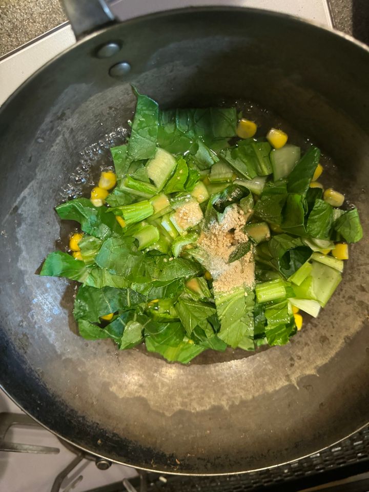 あんかけですから餡を準備しないとですね。わが家はウインナーを切るとケンカになるので、切らずに1人1本で添えています。今回はコーンに小松菜を入れて、こちらも「金の中華だし」で味付けです。煮浸しのように水分多めで煮ます。