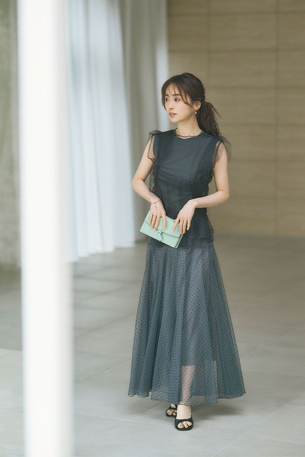 ベールをまとったような優美さが魅力のチュールトップスと、ドットシフォンがドラマチックなスカートで作るグレートーンでおめかし。