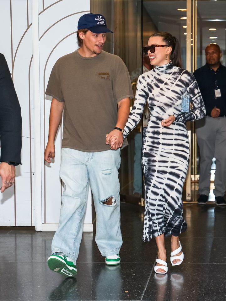 ミリーの著書『ナインティーン・ステップス』のプロモーションを終えたところをキャッチ。彼女はトレンドのタイダイ柄のドレスに白のサンダルで涼しげに。Tシャツ&ダメージデニムのジェイクとともに、Z世代のふたりらしい気張らないストリートスタイルを披露しました。