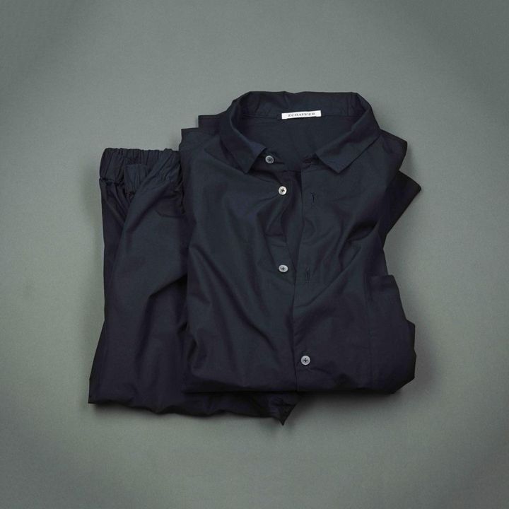 スヴィンコットンの上品なツヤ、高密度に織られているのに軽やか、ややパリッとしたハリ感とシワすらもおしゃれに見える素材感は、さすが素材にこだわって作られた1着という印象。さらに、コンビニはもちろん、渋谷や新宿だって行けちゃうんじゃないかというぐらいシンプルながらサマになるデザインは、いつもパジャマを隠しながらゴミ出しに行く私にとってまさに理想。トップスの裾をインして袖をまくり、ちょっと襟なんか抜いちゃえば、思わずヒールサンダルを合わせたくなるぐらい洗練されたセットアップなんです。