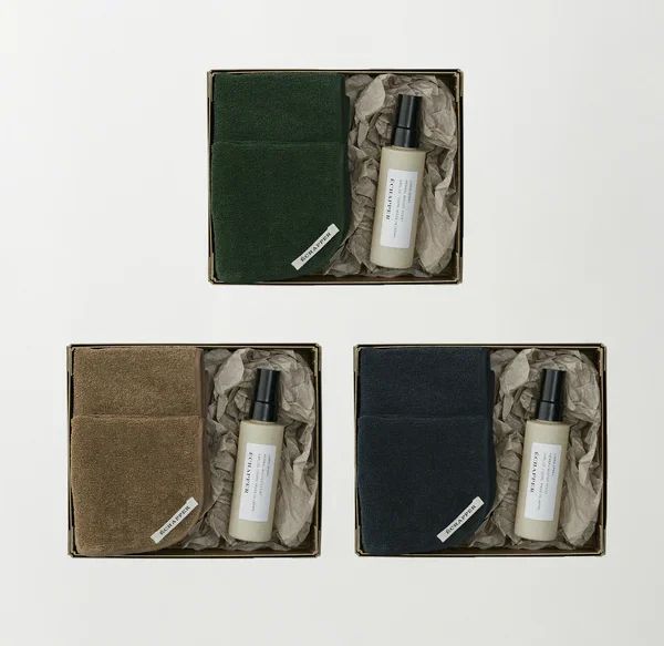 エシャペの顔ともいえるタオル。優れた吸水性と深みのあるツヤを兼ね備えたオーガニックの茶綿製のタオルは、ふっくらとした質感が特徴。天然精油のみを使用した優しい香りのリネンスプレーとセットで。ボタニカルカラーリネンチーフタオル&リネンスプレーギフトセット 各¥15,180(全てエシャペ)