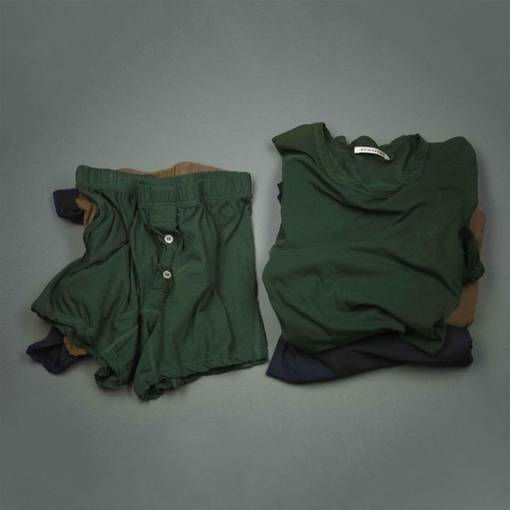 細番手のスヴィンコットンをハイツイスト、ハイゲージで編んだTシャツ&ボクサーブリーフ。柔らかで肌触りのよい素材は一度着たらヤミつきに。ボタニカルカラーソフトコットンTシャツ 各¥15,400、ボタニカルカラーボクサーブリーフ 各¥6,600(全てエシャペ)