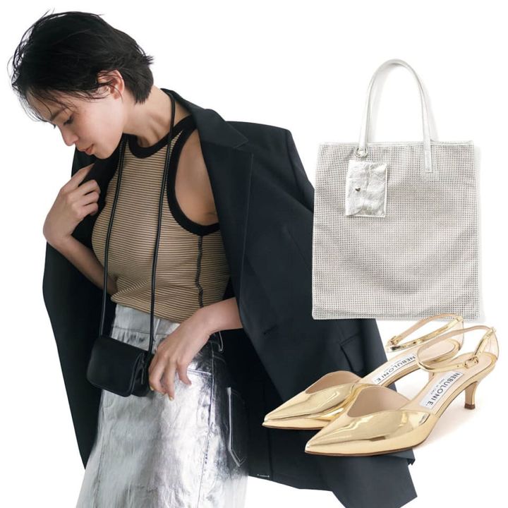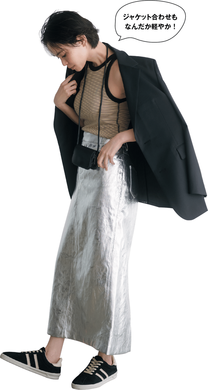 二の腕を出したくないという人もジャケットを羽織れば問題クリア。アメリカンスリーブだと少しだけ肌が見え、普通のタンクトップやTシャツよりもヌケ感が出るんです。タンクトップ¥11,000(トゥデイフル/ライフズ 代官山店)、ジャケット¥52,800(エイチ ビューティー&ユース)、シルバースカート¥8,990(マンゴ)、バッグ¥17,050(ヤーキ/ヤーキ オンラインストア)、スニーカー¥35,200(グラフペーパー/グラフペーパー 東京)
