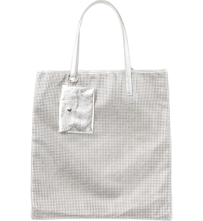 着こなしのアクセントにもなるギラッと小物たち。パンチングトートバッグ¥20,900(マルコマージ/ジャーナル スタンダード レリューム ルミネ新宿店)