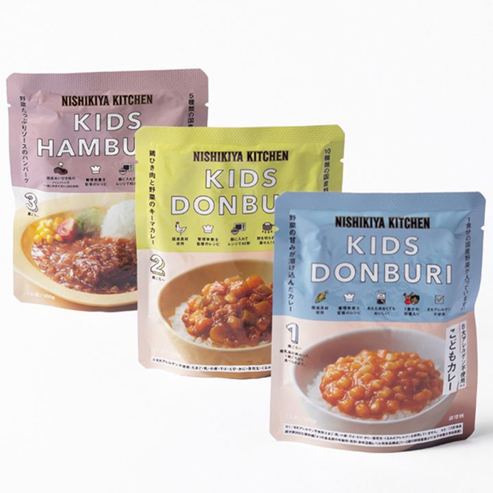 「慣れない保存食では、子どもの食が進まないことも。ローリングストックで普段から活用を。1、2、3歳〜と用意があるニシキヤキッチンはどれもおいしい」(渡邊さん) キッズシリーズ¥280〜(すべてニシキヤキッチン)