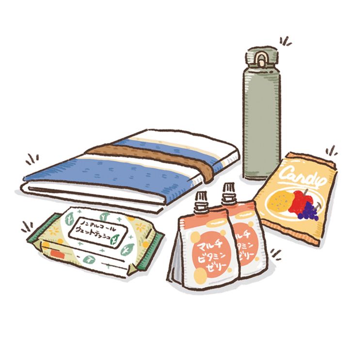 「衛生を保つためノンアルコールのウェットティッシュ、横になりたくなると思うのでレジャーシート、ゼリー飲料、飴玉、水筒はマストで準備。加えて、持てるなら充電器や簡易トイレもあれば」