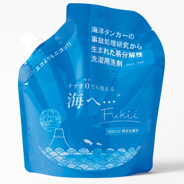 「すすがなくていい洗濯洗剤は緊急時の節水に」(渡邊さん)。油汚れはもちろん泥汚れも落とし、普段使いしたい環境にも優しい洗剤。薄めれば掃除にも使えます。 海へ…Fukii詰め替えパック[380g]¥2,552(がんこ本舗)
