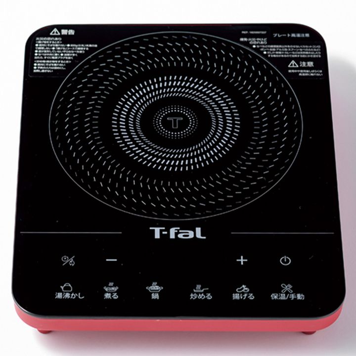 「カセットコンロと併せて用意」(渡邊さん)。阪神淡路大震災時、神戸市ではガスが85日、水道は91日、電気は7日で復旧。 フルフラットIH リーガルレッド¥11,000(ティファール/ティファールお客様相談センター)