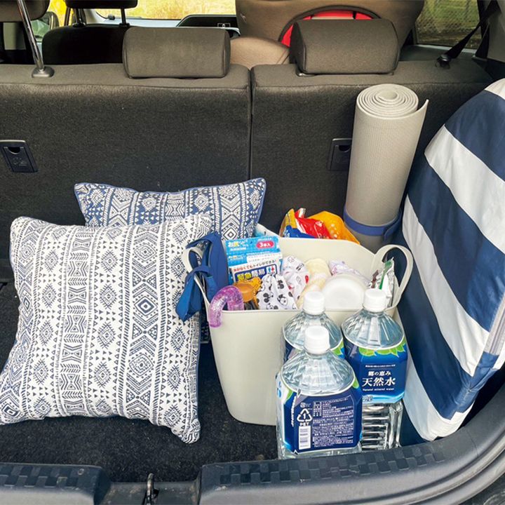 渡邊家の車の中。「水も運べるバケツに、水、携帯トイレ、カトラリー、全員分の着替えやタオル、テントとレジャーシート、雨具を常備。ピクニックや日帰り温泉で日頃から使ってローリングストック」