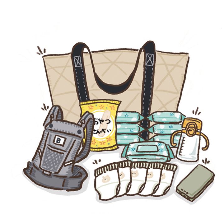 「ママバッグ=防災バッグ。36時間は生き延びられるよう、子どもが食べ慣れたお菓子やエナジーフード、多めのティッシュやオムツ、あと逃げたり手ぶらで活動するためには抱っこ紐がマスト」