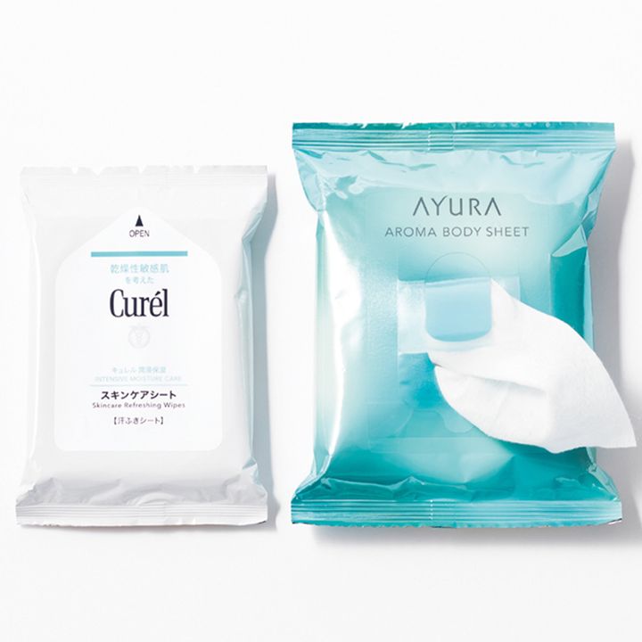 左・「敏感肌用の安心ブランドで、子どもと一緒に使用」医薬部外品。 キュレル スキンケアシート10枚入り¥330 ※編集部調べ(キュレル/花王) 右・「ベタつかず大判サイズなのもうれしい」(ともに美容ライター・矢﨑彩さん) アロマボディシート15枚入り¥825(アユーラ)