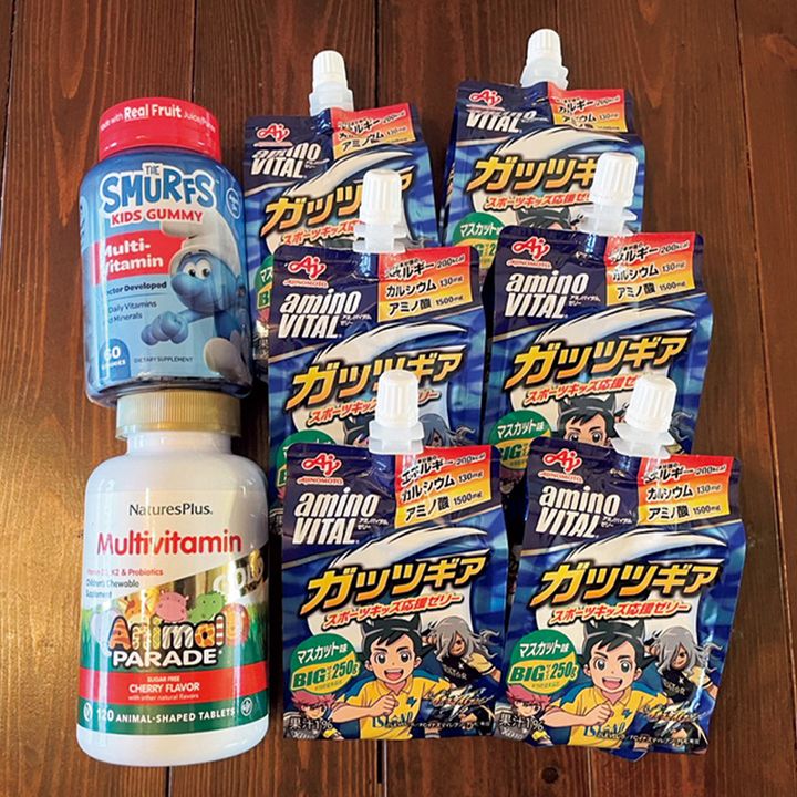 「非常食は炭水化物ばかり支給されることが多く、栄養の偏りが心配。iHerbの子ども用マルチビタミン、アミノバイタルなどサプリを用意し普段から摂取しています。味に慣れておくことが大事」