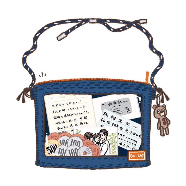 「硬貨1,000円分、家族写真、名前・学校名・親の名前と電話番号・アレルギーや既往症を書いたカード、保険証コピー、『一人です。助けてください』と書いたカード、飴玉を防水ポーチに」