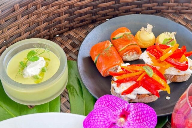 ▲冷製ポタージュサンジェルマン ピパーチ風味のクレームフェッテ、トリュフポテトとグジェール、ブッラータとペペローナのブルスケッタ、サーモンのルーラード セルヴェル・ド・カニュ