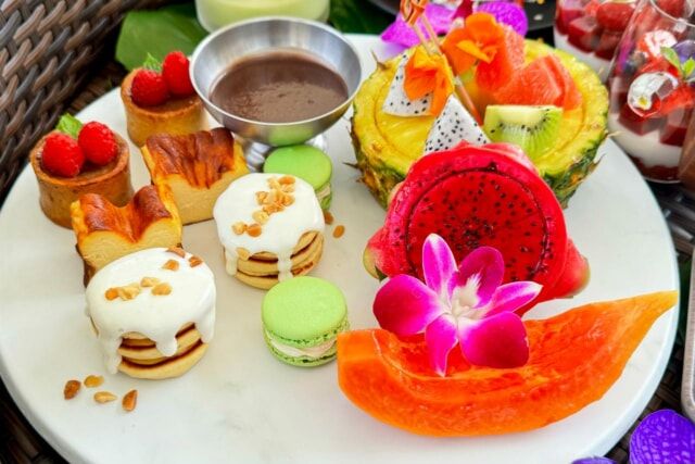 ▲シークヮーサーマカロン、パンケーキ マカダミアナッツソース、西表島産黒糖とさんぴん茶のクレームブリュレ、フルーツチョコレートディップ、バスクチーズケーキ