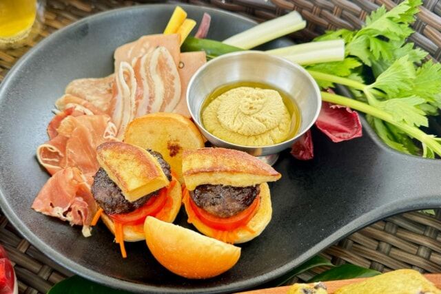 ▲野菜のクルディテとフムス コールドカット、石垣牛パティとフォアグラのスライダー