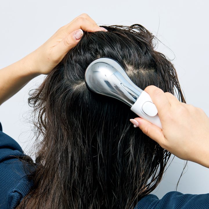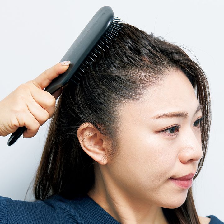 パドルブラシで生え際から斜め上の頭頂部に向かって髪の毛に空気を入れ込むようにブラッシング。