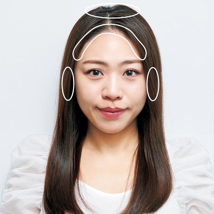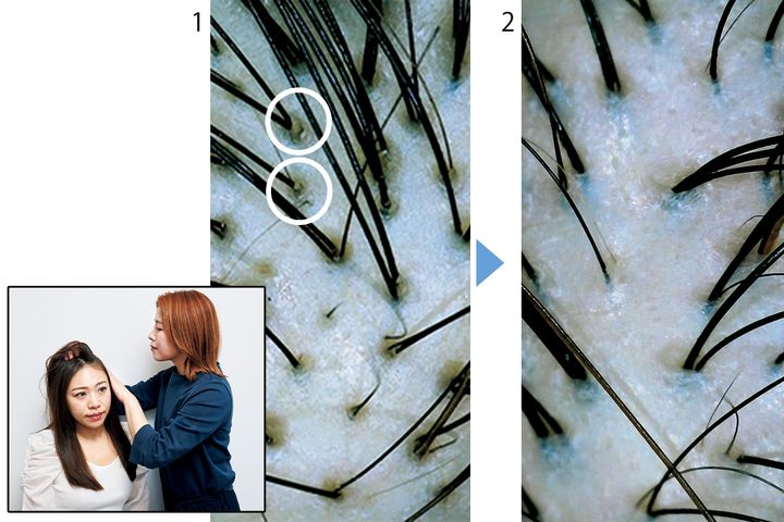 毛穴まわりがくぼんでいれば健やかな状態。毛穴が角栓で埋もれている、皮脂で盛り上がっている場合はよく洗髪して。