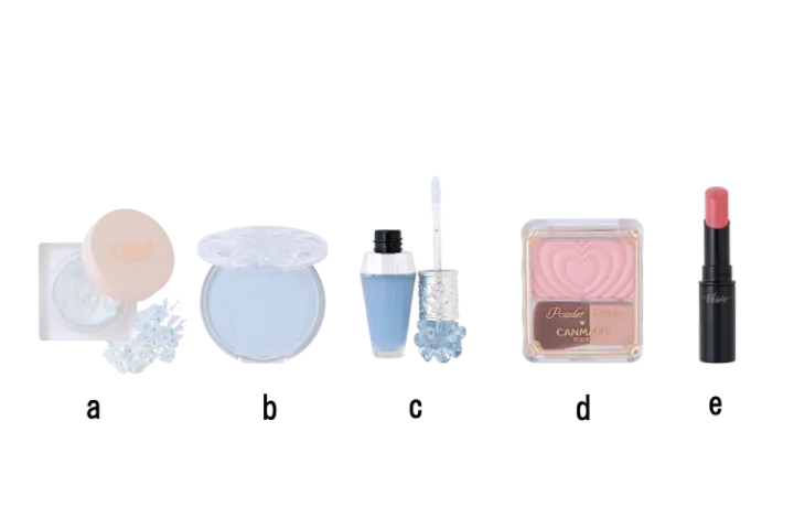 ほお全体にブラシでdを薄くのせ、肌のトーンをブルベ寄りにシフト。そのうえで、青みのツヤきら要素を目元や口元にちりばめる。bを上まぶたの中央と目頭、鼻筋にオン。目頭は濃いめ、他は薄めに塗る。