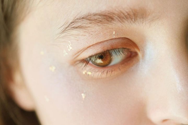綿棒の先端にaをとり、グリッターの粒を目頭や目尻にランダムに置く。eを唇の中央に直塗りし、cを唇全体に塗る。