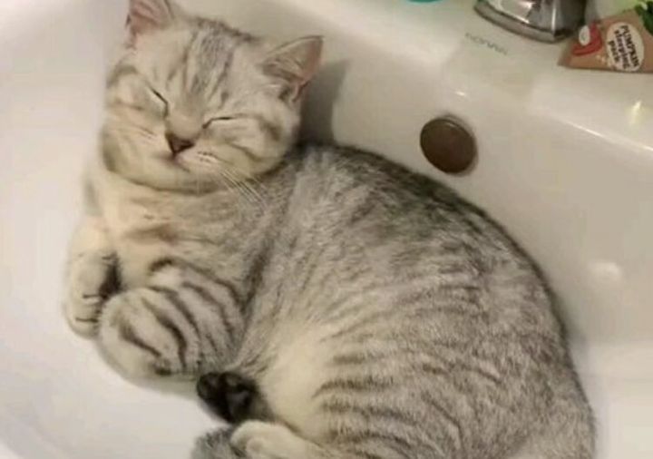 洗面台で寝ている猫さん。どいてくれないのでそのまま水を流したら?