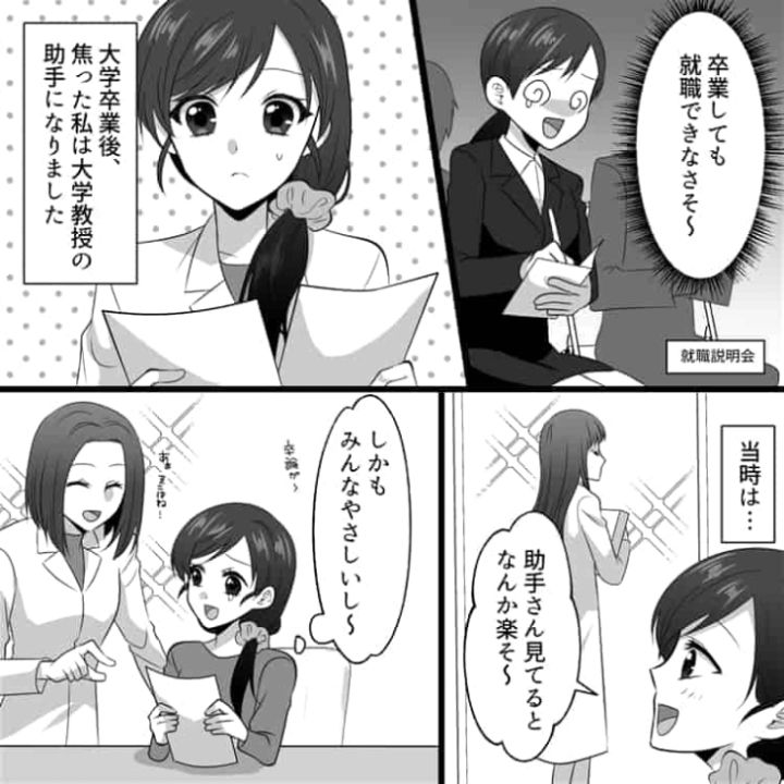 就活の大変さから大学教授の助手になった主人公。楽そうな仕事と想像していましたが、実際はそうではないようで・・・。