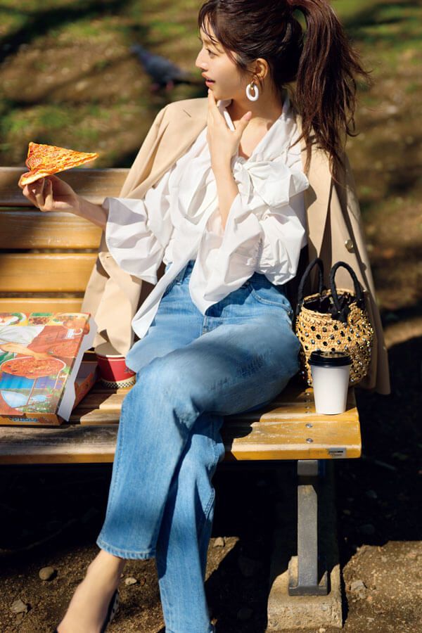 ボウタイとフリル袖がエレガントな白ブラウスは、デニムを女っぽく昇華させたい日の相棒にも適任。ジャケットを肩に引っ掛ける都会的な着こなしで、ラフでいて洗練感漂うスタイルに。