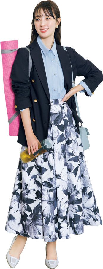 ネイビージャケットと合わせれば、シックな花柄スカートの凛とした華やぎがアップ♡ ジャケットのインはライトブルーのシャツできちんと感を高めると、頼れる大人な先輩として後輩の目に映るはず。