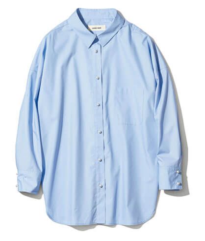 ブルー地にパールボタンの白いきらめきがさわやか。ベーシックなブルーシャツのボタン部分に小粒パールてがあしらわれ、ほどよくレディ♡ 清潔感満点な1着です。