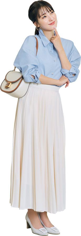シンプルなシャツとスカートのワンツーコーデは、ブルー×白の爽快配色で清潔感アップ。シャツの袖を無造作にたくし上げる着こなしで、それとなく抜け感を演出して。シンプルな着こなしも、シャツに配されたさりげないパールで地味見えしない!