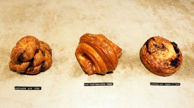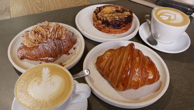 今回注文したのは、トラディショナル(プレーンのクロワッサン)、アーモンド、チーズ&ベジマイトの3種類とラテ2杯。トラディショナルが7.1オーストラリア・ドル(約740円、以下AUD)、アーモンドは11.7AUD(約1,125円)、チーズ&ベジマイト10.7AUD(約1,120円)。