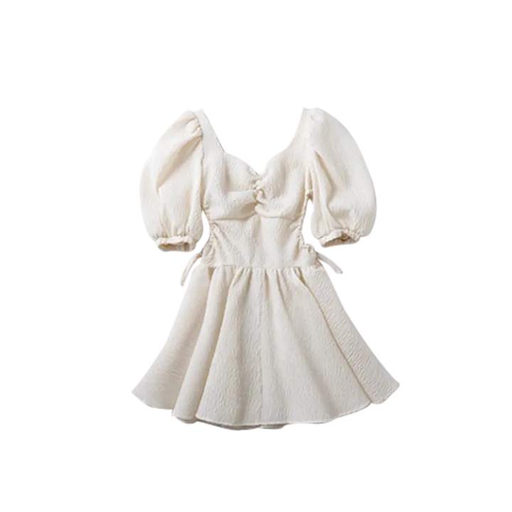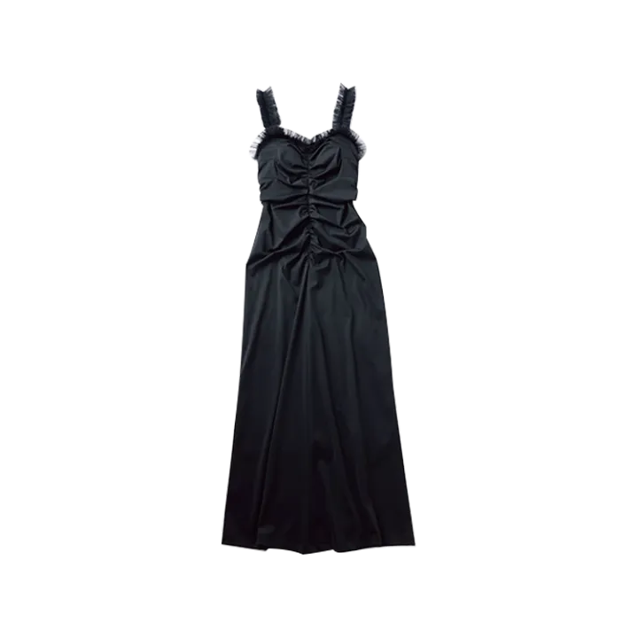 胸元からウエストにかけてのシャーリングとチュールが女みたっぷり。ウエストマークだからスタイルアップ効果抜群♡