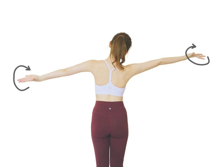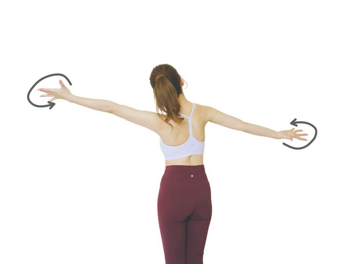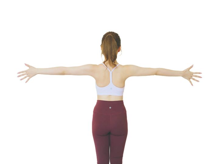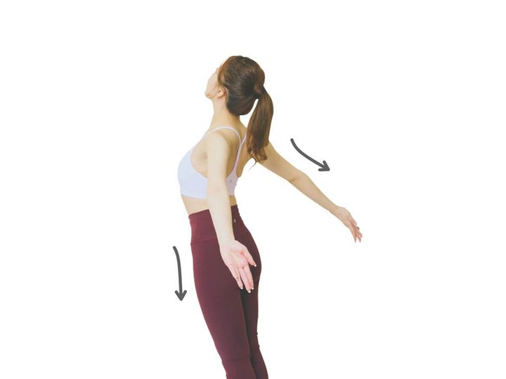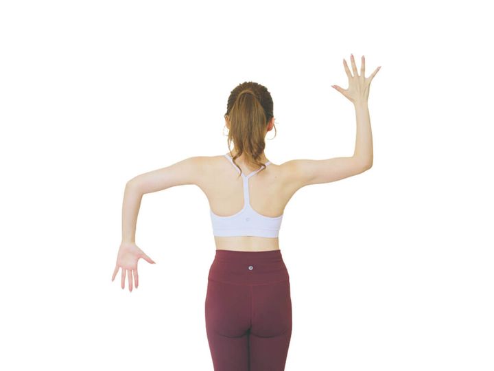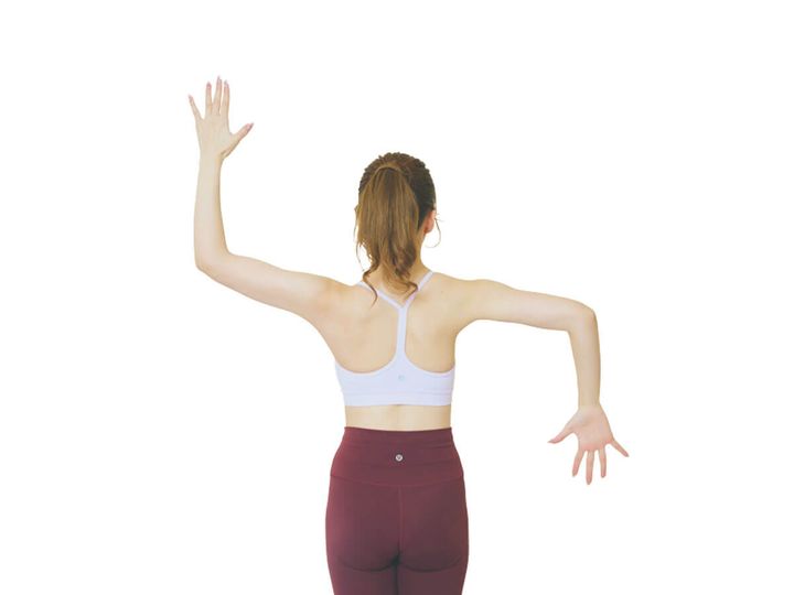 手のひらの向きと首の傾きはあまり意識せず、 両腕が遠くに引っ張られるようなイメージで。気持ちよく二の腕と首筋が伸びるのを感じて。