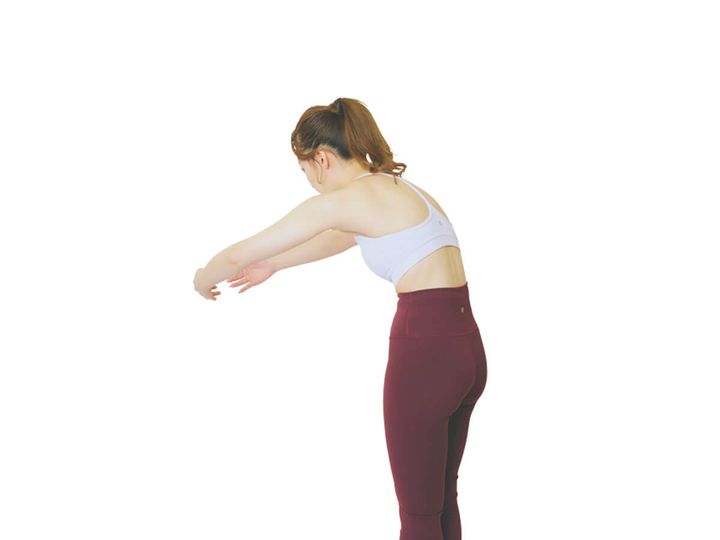 真っすぐ立った状態で手のひらを内側にして、両腕を前に出す。肩と二の腕の付け根の伸びを感じながら、背中を丸めた姿勢に!