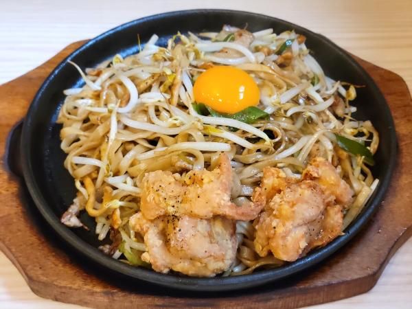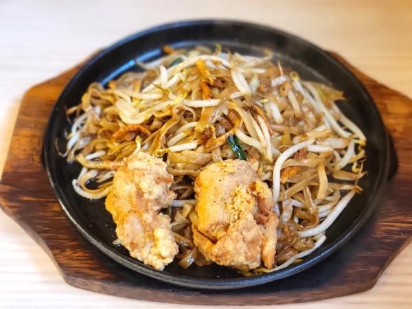 ゆでたての麺はモチモチ食感の平打ち麺。熱々の鉄板で焼かれ、しっかりした濃いめのソースで少し焦げた部分がパリッと香ばしくてたまりません。肉汁あふれる唐揚げとやっぱり合う!シャキシャキのモヤシもたっぷりで、食べるとわかりますが見た目よりも意外とボリュームあります。