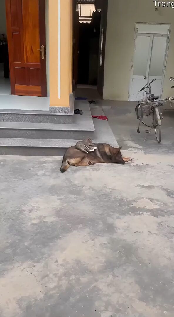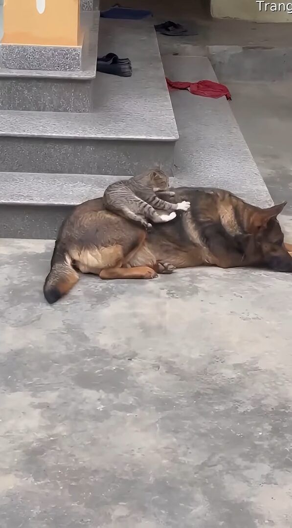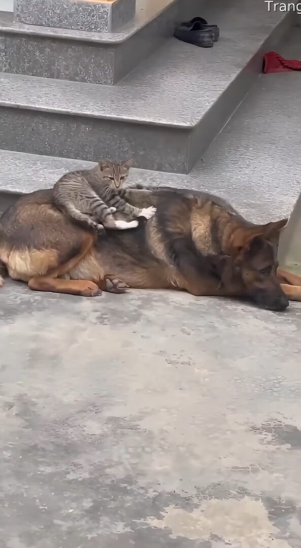 寝そべったイヌの背中に、ネコがちょこんとおすわり。 イヌの背中をベッドにしてくつろいでいるのかと思いきや、ヌの背中をふみふみマッサージしてあげていたのです!!