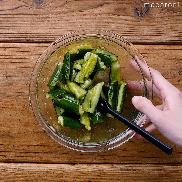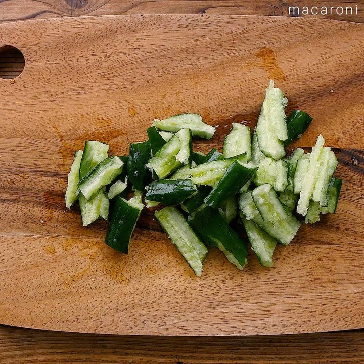 1: きゅうりは麺棒で軽くたたいて、手で食べやすい大きさにちぎります。