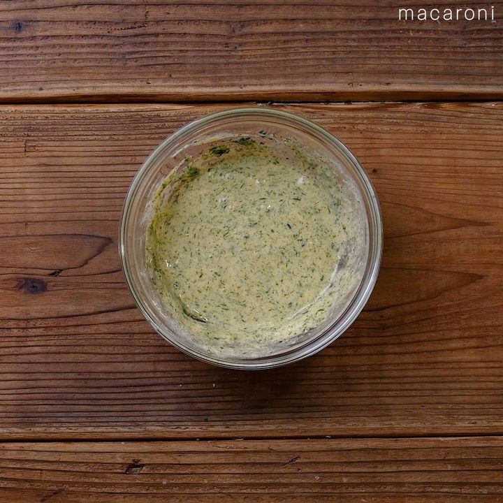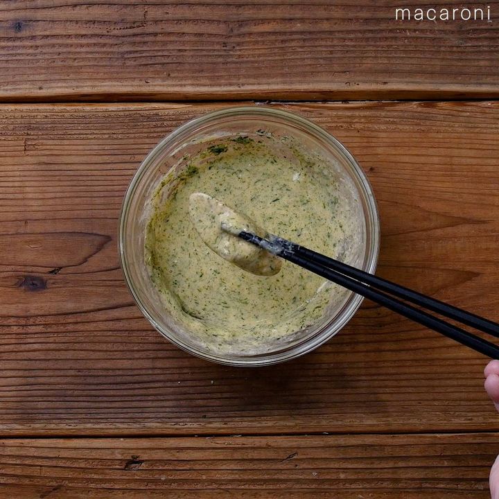 3: ボウルに卵、マヨネーズ、粉チーズ、青のりを入れて混ぜ合わせます。