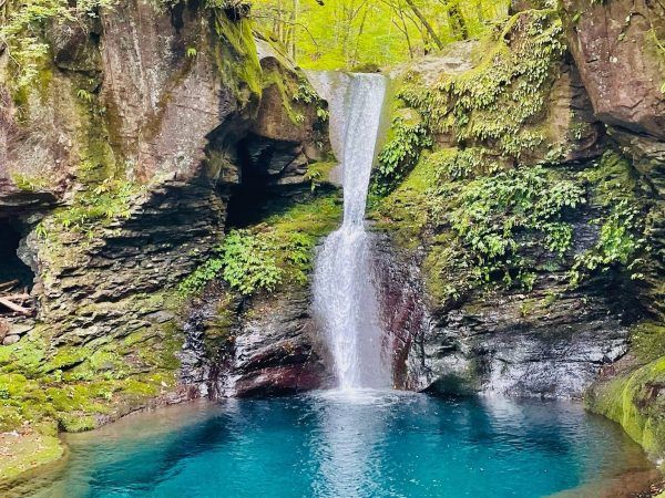 すると、圧巻の光景が見えてきます。滝壺が透き通って綺麗ですね。光の加減で青く見えるようです。
