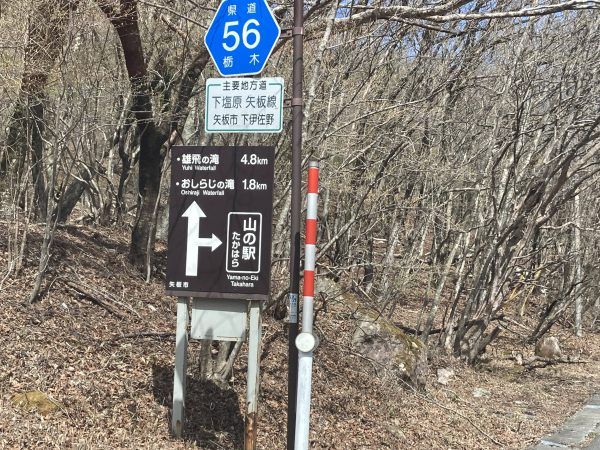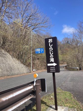 ここから車で2㎞ほど先に駐車場があるのですが、地図で「おしらじの滝」と入れるとまだ看板が見当たらなかったので、看板が出てるところまでもう少し行きます。(下記の地図は「山の駅たかはら」に設置しています。)見逃しそうなのですが、よく見ると看板が出ていました。駐車場はあまり台数がとめれないので早めに来ることをお勧めします。