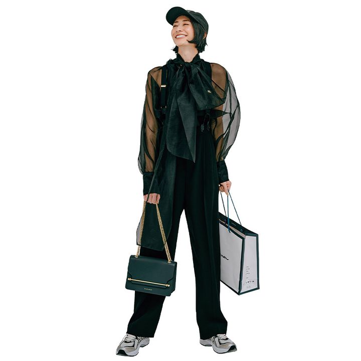 ボリューム感のあるブラウスも シアーな素材でコーデにメリハリを。 マンネリしない黒パンツコーデに