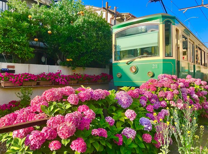 江ノ電とあじさいのコラボレーション〜御霊神社〜