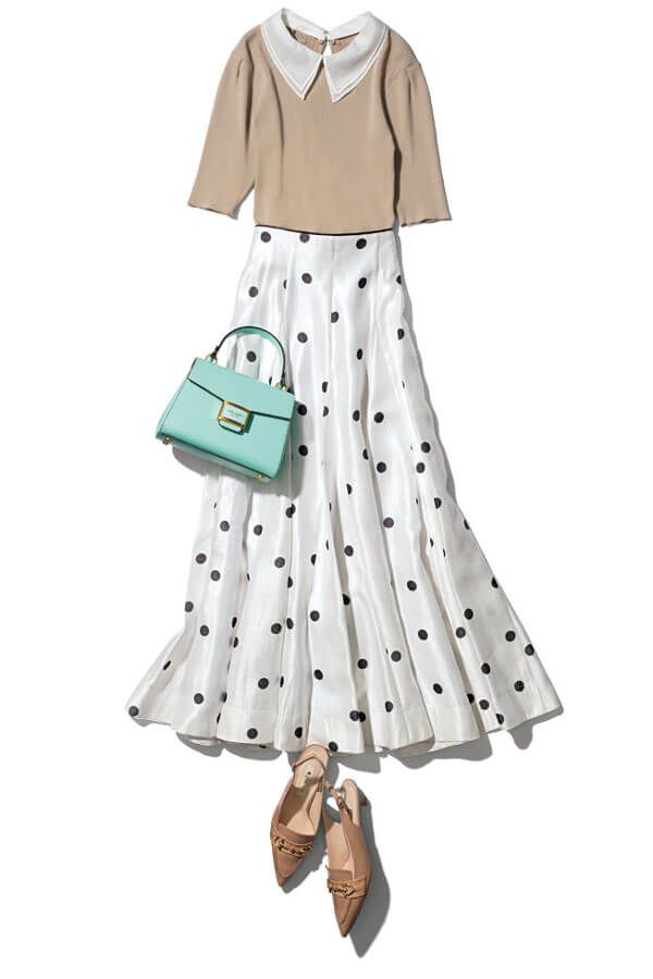 梅雨が迫る蒸し暑い時期に、1枚で着たい半袖のリブニット。白の襟やスカートのドット柄で令嬢ムードを高めたら、小物もお育ちよさげなかっちりデザインでとことん上品に。