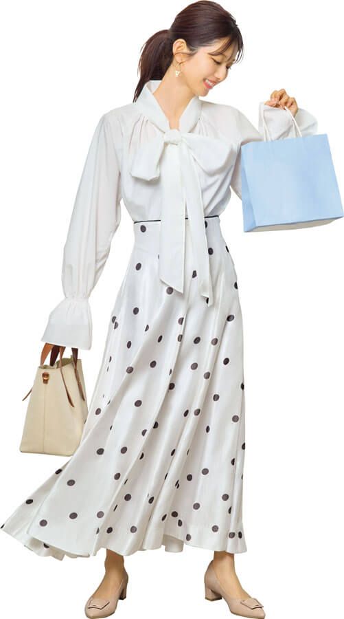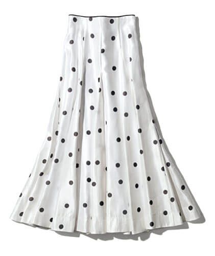 シックなモノトーンならドット柄が大人スイート。白地多めの涼やかな配色なので、清楚さキープもお任せ。シルエット美でも魅了を。