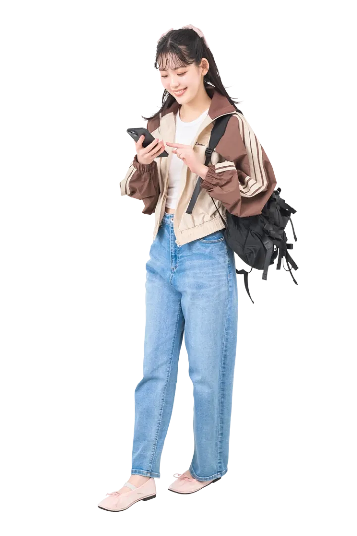 デニムやトラックジャケットでスポーティーな印象に。リュックもおしゃれに魅せる小物使いがポイント♡