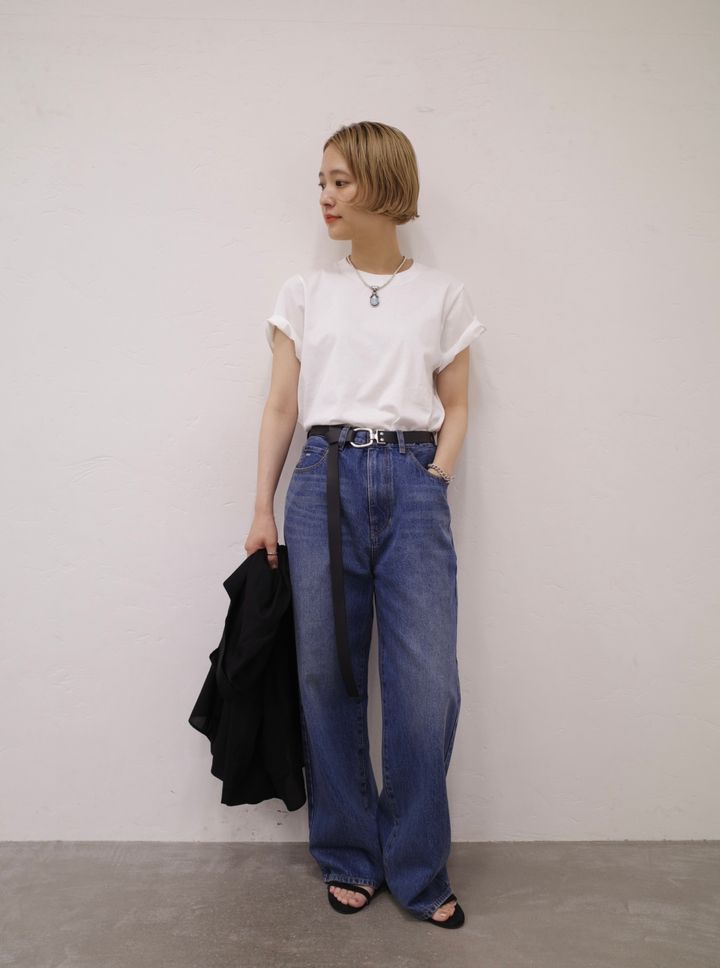ビッグT×コンパクトキャミで作る表情たっぷりの重ね着スタイル。「ホワイトトーンで統一している分、単調に見えないようにレイヤードをしたり、素材感のある小物でアクセントを加えたりと工夫をしました」