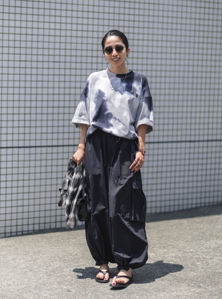 モノトーンスタイルならタイダイ柄も大人シックに。「Tシャツはザ・ノース・フェイスのオーガニックコットン製。あえてメンズのMサイズをゆるいシルエットで楽しんでいます」