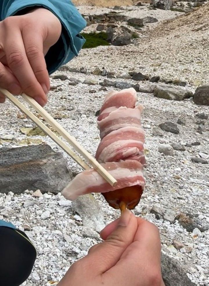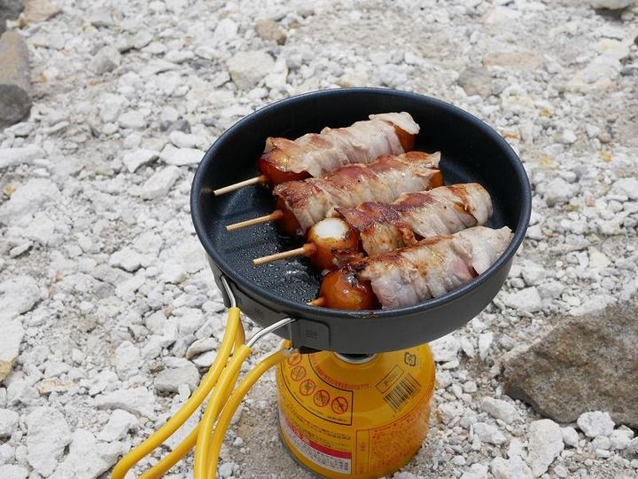 今回のメニューは、一緒に登った友人リクエスト「豚バラみたらし」。